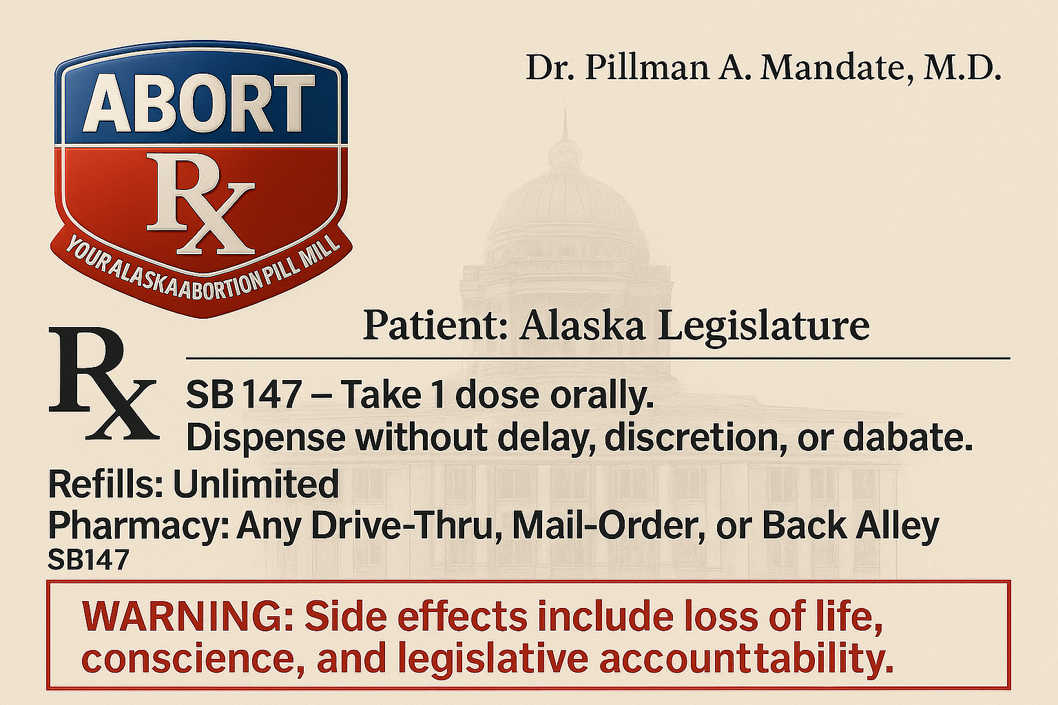 DEADLY Senate Bill 147 & House Bill 195 (two versions of the same bill introduced in both chambers) expands the availability of the RU-486 Chemical Abortion Pill, Mifepristone from 2 to 300+ abortion sites. Every Mifepristone pill kills a baby waiting to be born.